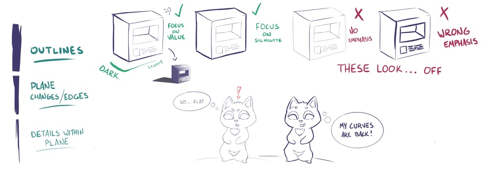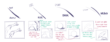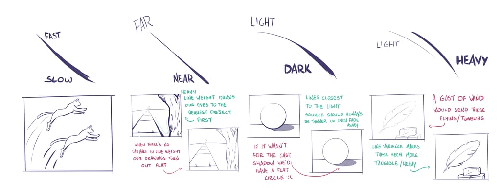 Line work won't always be easily distinguishable in final pieces. But, when you sketch, it's best to start light and work your way up to bolder lines where necessary. Setting apart areas of light or shadow with line weight helps greatly later on during the rendering process. If this concept doesn't make complete sense, that's okay! This is only an introduction, we'll go more in-depth later on.