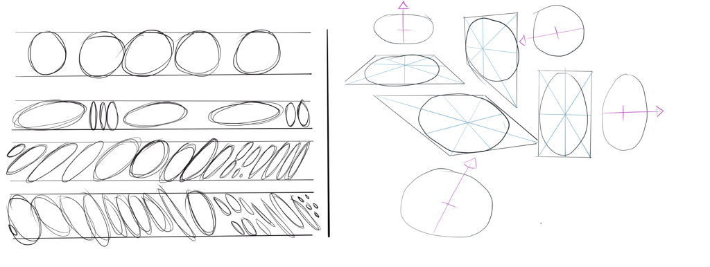 For your second exercise, lay down a few rectangles with guides in various perspectives. Within these frames, make ellipses that touch all 4 sides of the frame. Next to the frame try to make the same ellipse. This will start training your eye to recognize how an ellipse looks in perspective.