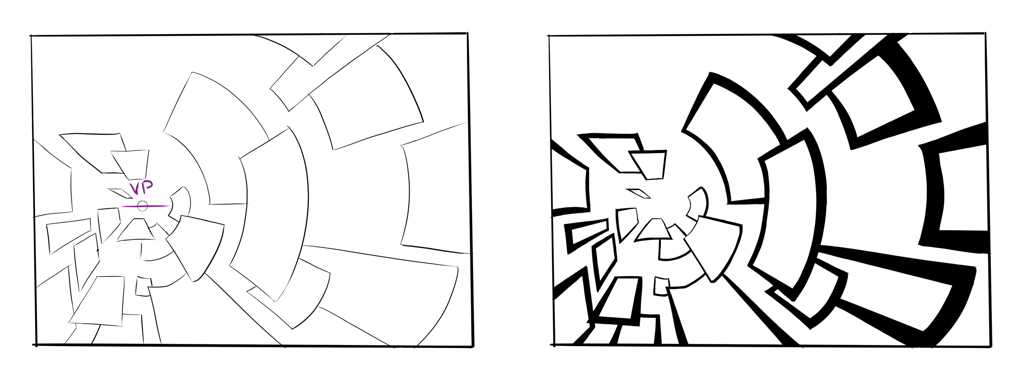 Just like the leading lines exercise from part one, there should be a clear direction & flow to your shapes. This time, I'll have you use a vanishing point. You can put it anywhere on the page as long as every shape matches up to it.