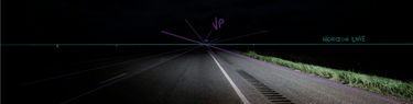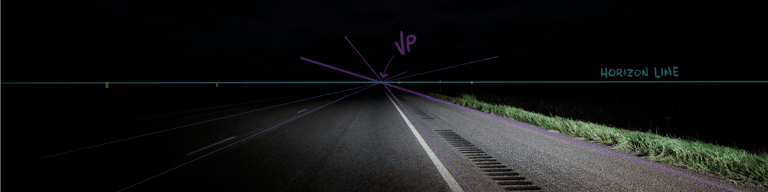 Roads are a great real-life example of lines converging towards one vanishing point. The road obviously doesn't just stop at that point, we simply can't see further because it is past the horizon line. This horizon line is always dependent on eye level. If this picture were to be taken from higher up, the horizon would fall lower in the frame. And vice-versa, if we were to lay on the ground and take the photo, the horizon line would be higher in the frame.
