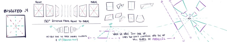 These guidelines act as reference points & make it obvious that we're still looking at a rectangle no matter the orientation of the rectangle. Now: bend, rotate, & fold the paper as you take pictures of it. Then draw the paper as you see it on the photos. Guidelines included.